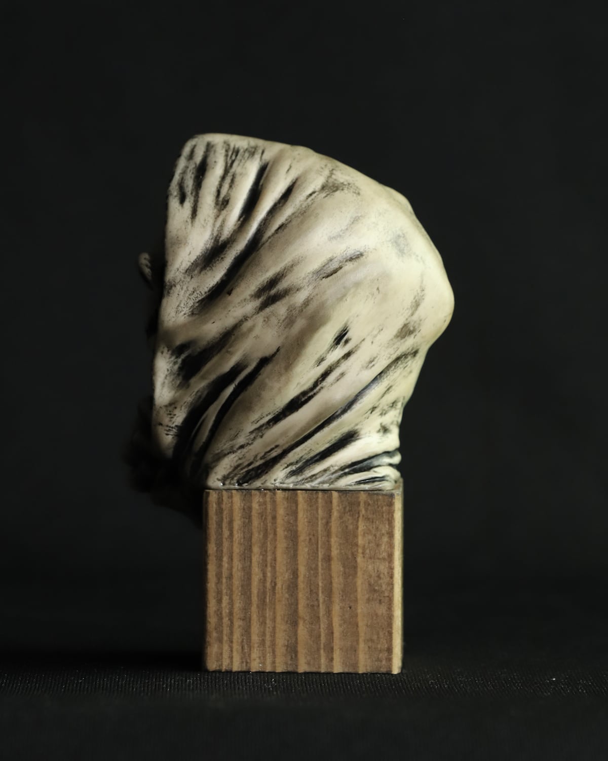 深く被るローブはその顔の向きに沿るシワを彫り込みリアルな躍動感を表現
