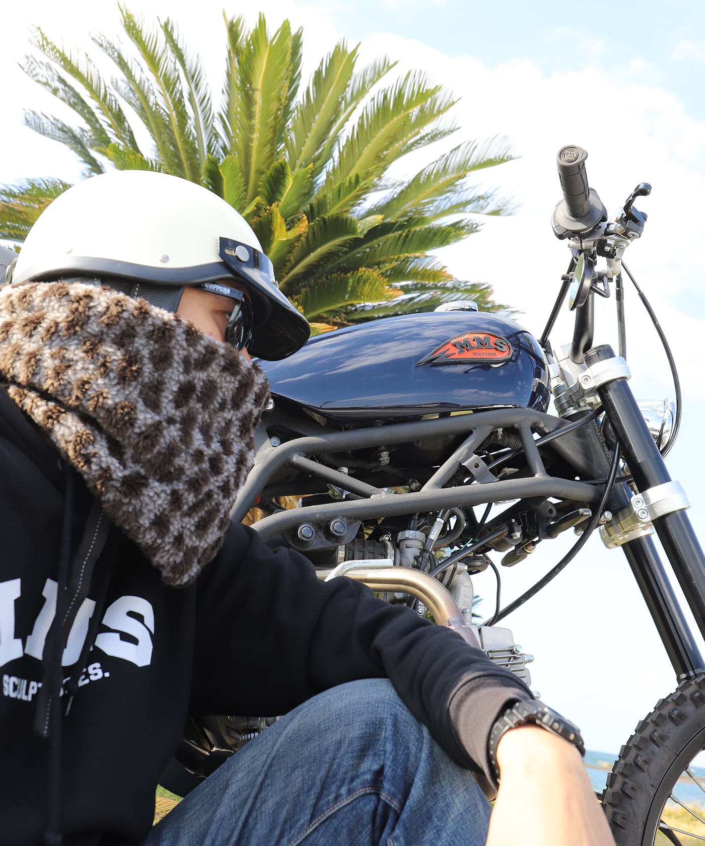 造形師でありバイカーでもあるM&Msが求める「ROUGHに。かつカッコいいシルエット」を追求し独自のフォルムで設計したROBIN NECK WARMER