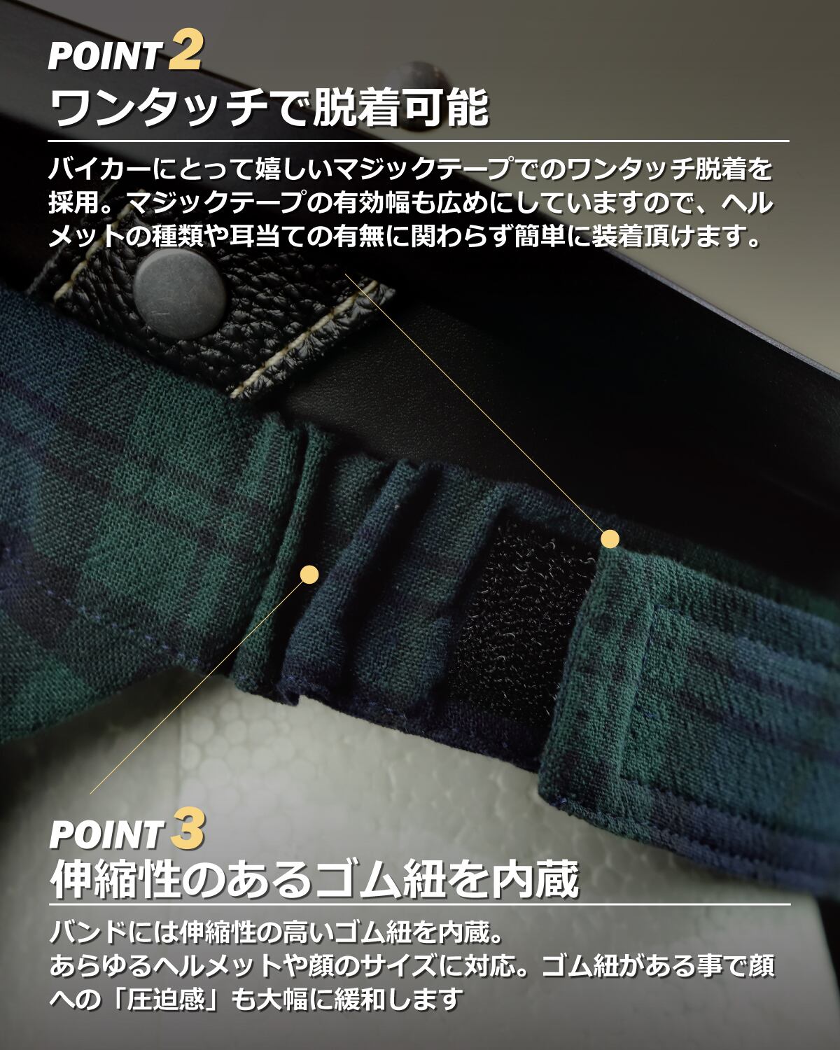 あらゆるヘルメットや顔のサイズに対応。ゴム紐がある事で顔への「圧迫感」も大幅に緩和します