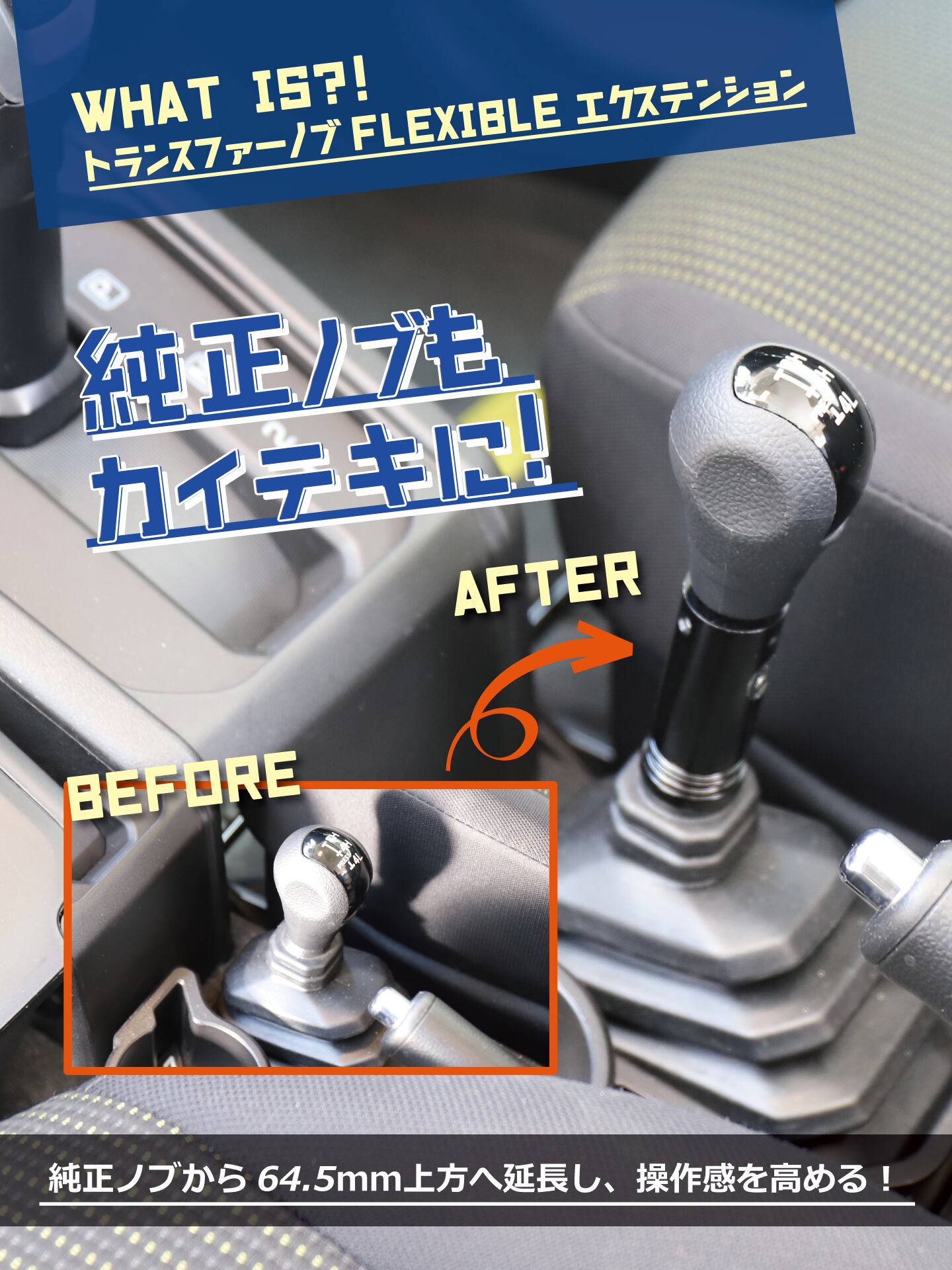 ジムニー(JB64W)/シエラ(JB74W)/ノマド(JC74W)のトランスファーノブの位置を64.5mm上方に延長し、操作しやすいポジションに改善!