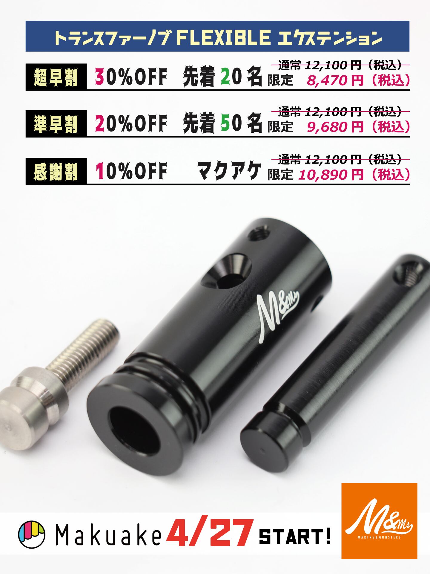 M&Ms(メイキングアンドモンスターズ)オリジナルトランスファーノブエクステンションは純正ノブの延長のみならず、あらゆるシフトノブの装着も可能になります!
