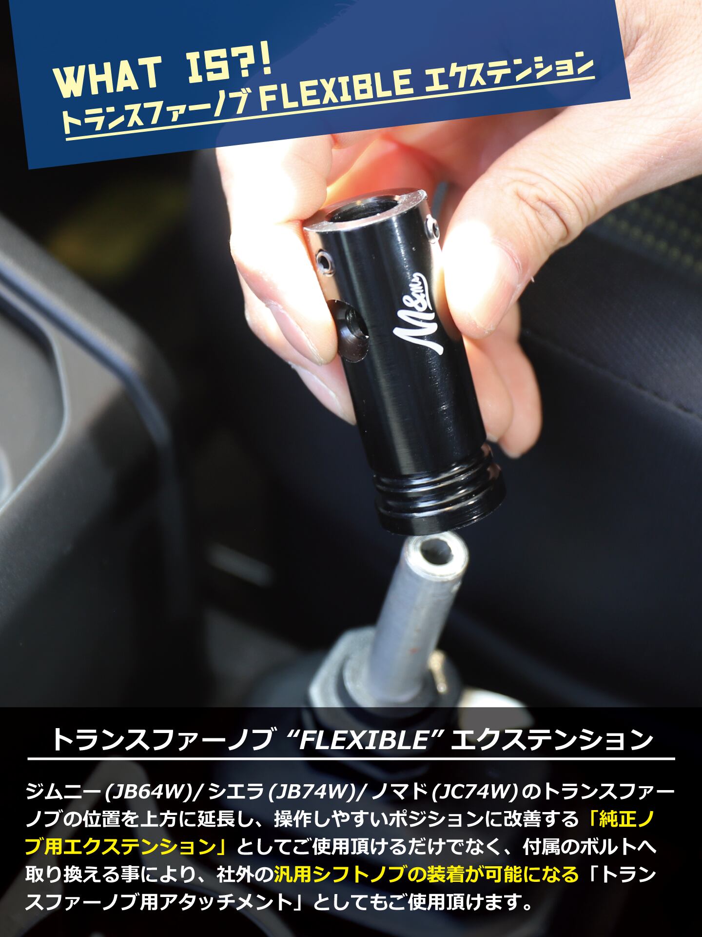 M&Msオリジナル 「トランスファーノブ “FLEXIBLE” エクステンションキット」は、ジムニーのトランスファーノブの位置を上方に延長し、操作しやすいポジションに改善する「純正ノブ用エクステンション」として使用可能。