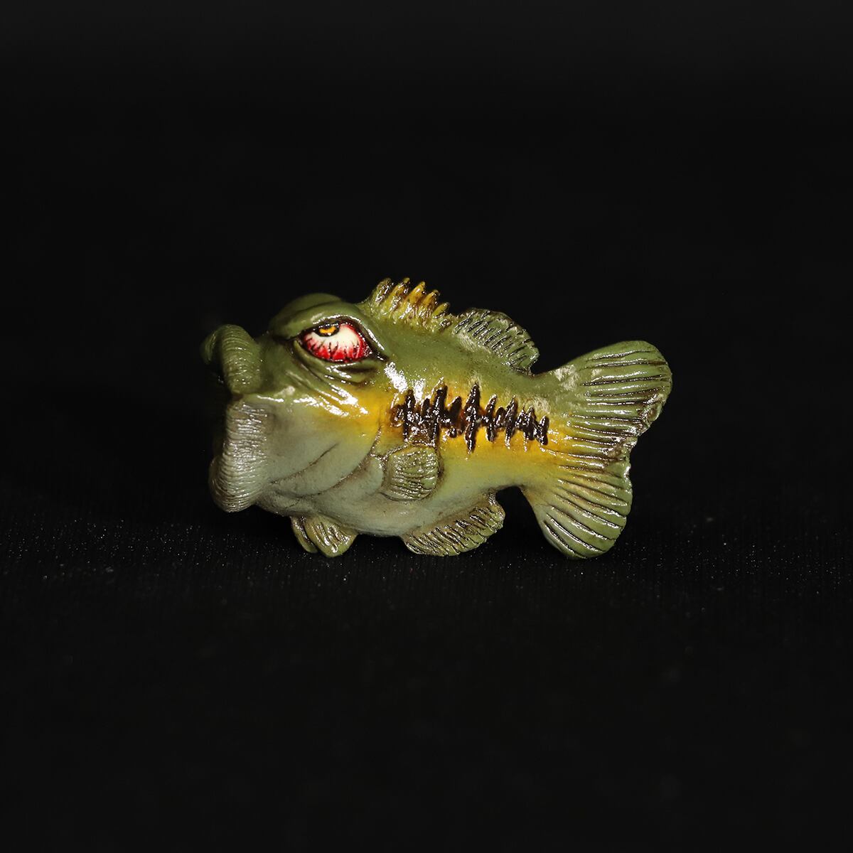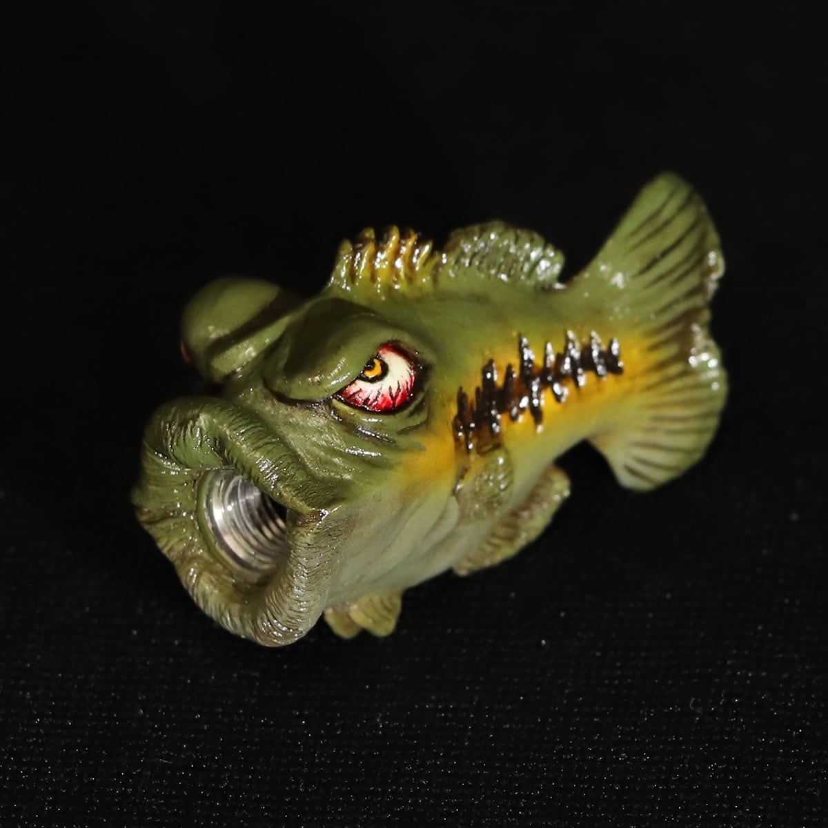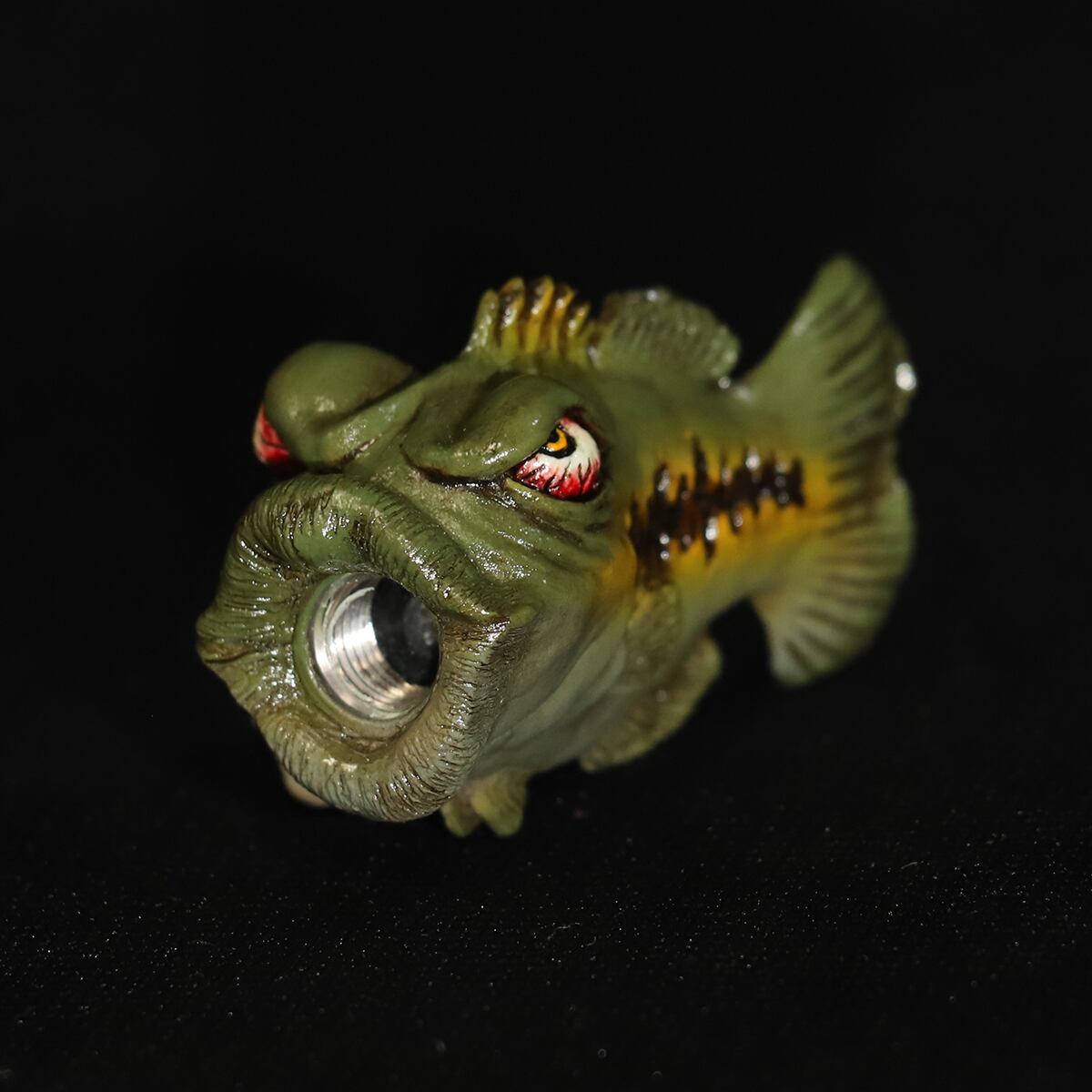 釣りあげられるブラックバスの葛藤をM&Msらしい解釈で表現したM&Msオリジナルバルブキャップ。
