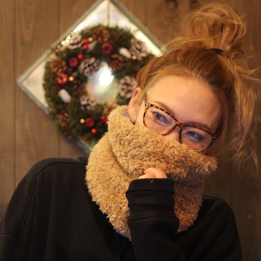 顔、首元両方をカバーしつつ、首元がごわつかないよう細部のサイズ感を徹底調整。