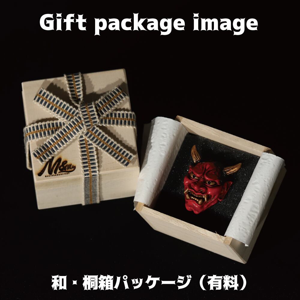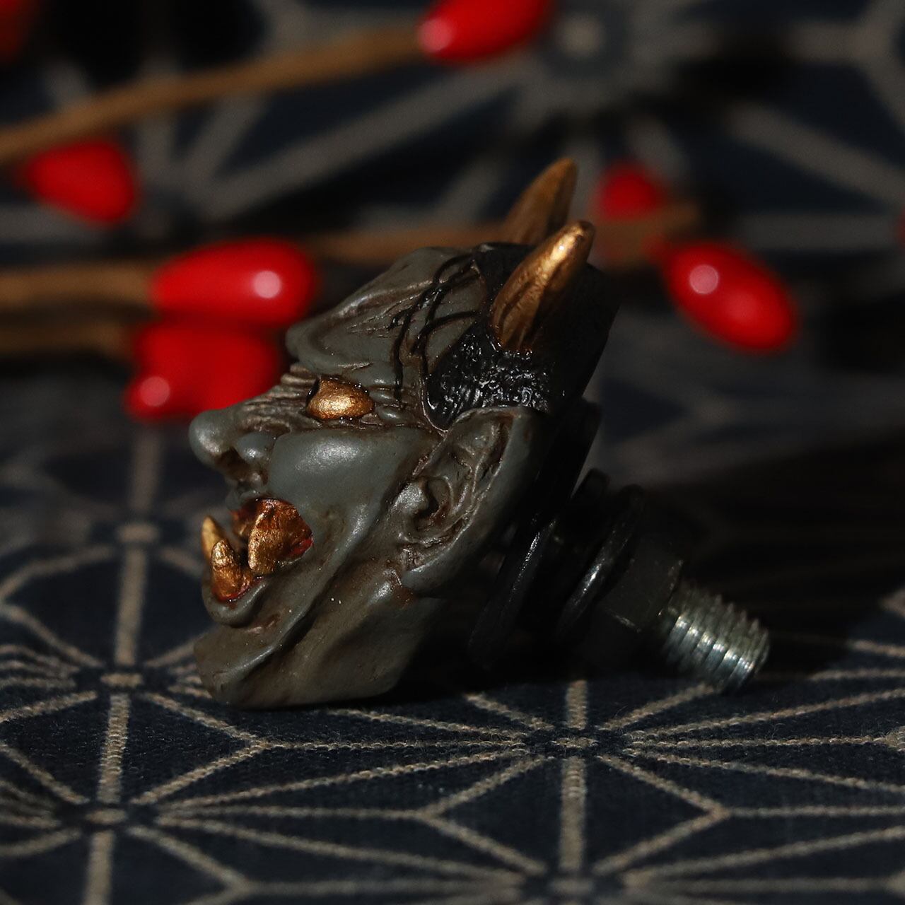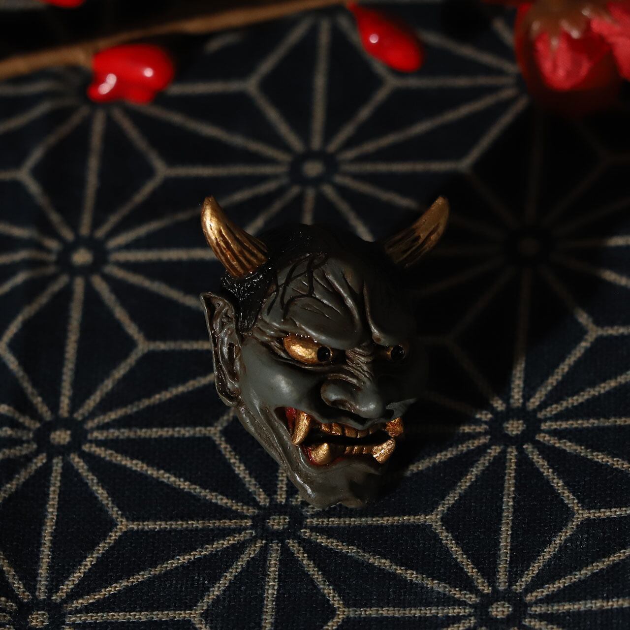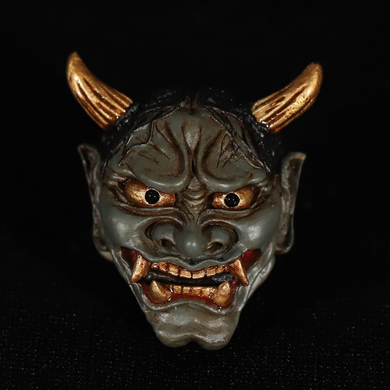 古めかしさを持つ肌感に、その強い怒り・悲しみを表現するシワにはより迫力を持たせる墨を入れ、角・牙・眼球は金色に輝かす。