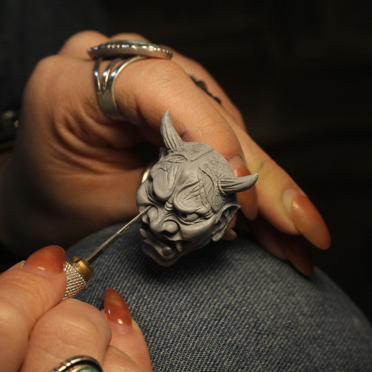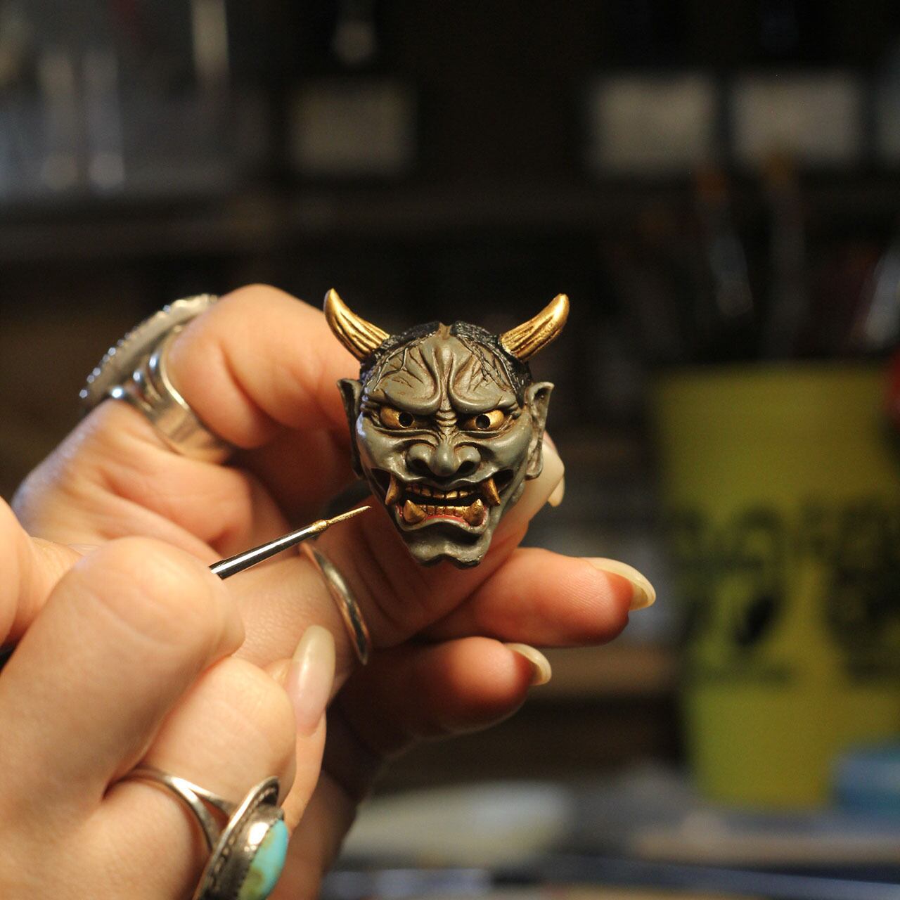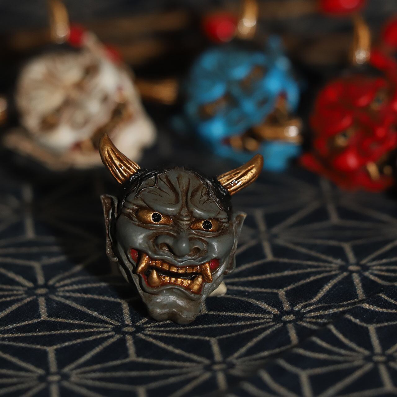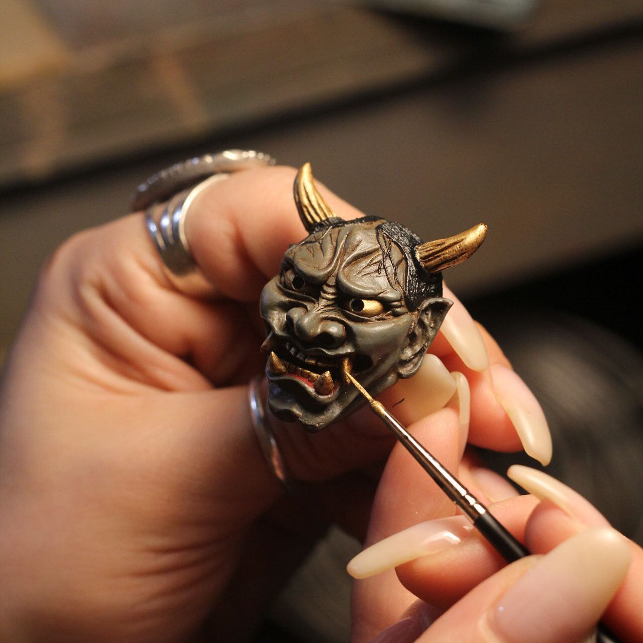 古めかしさを持つ肌感に、その強い怒り・悲しみを表現するシワにはより迫力を持たせる墨を入れ、角・牙・眼球は金色に輝かす。
